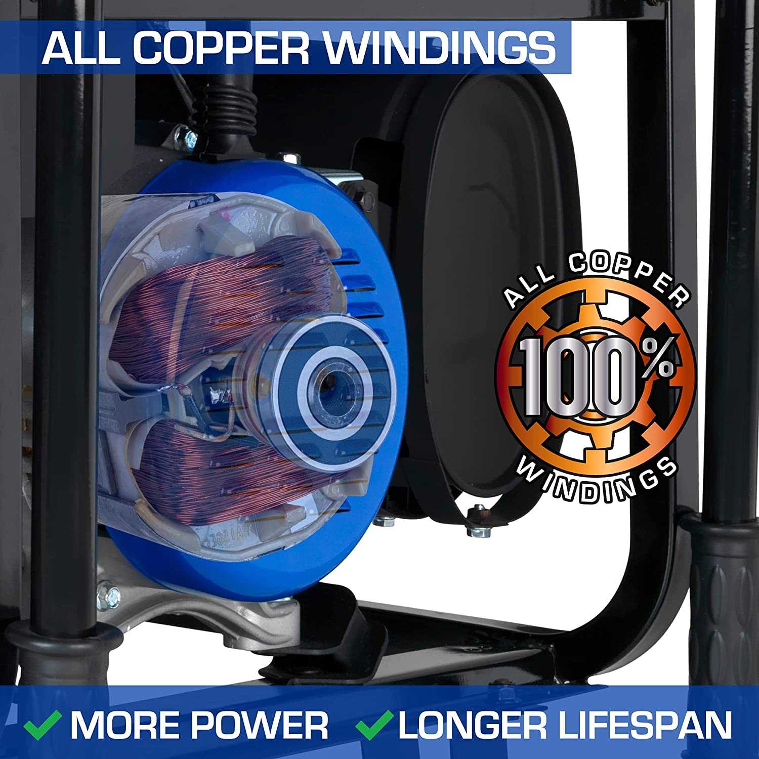 It is the most powerful generator on our list as it is capable of providing 9500 watts of running power and 12500 watts of peak output when run on gasoline. It also has a very good output on propane with 8500 watts of running power and 11 200 watts of peak power.
