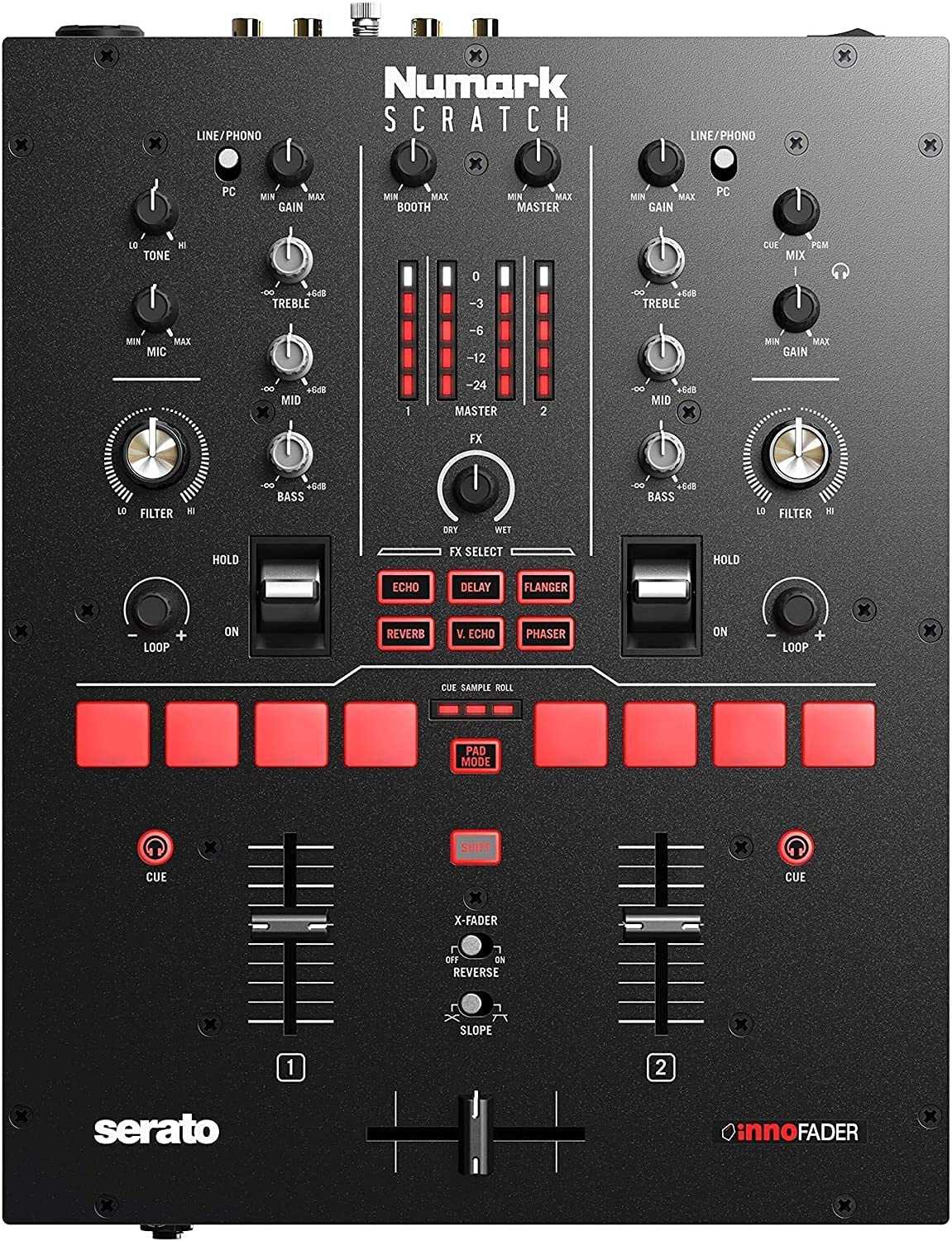 On the front, you have your innovator scratch fader. Very good fader everybody’s used these before and by now you know that they’re very buttery smooth.